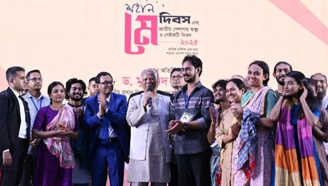 মহান মে দিবস এবং জাতীয় পেশাগত স্বাস্থ্য ও সেইফটি দিবস-২০২৫ উপলক্ষে আজ রাজধানীর বাংলাদেশ চীন মৈত্রী সম্মেলন কেন্দ্রে আয়োজিত অনুষ্ঠানে প্রধান অতিথির বক্তব্যে অধ্যাপক ইউনূস এ কথা বলেন।