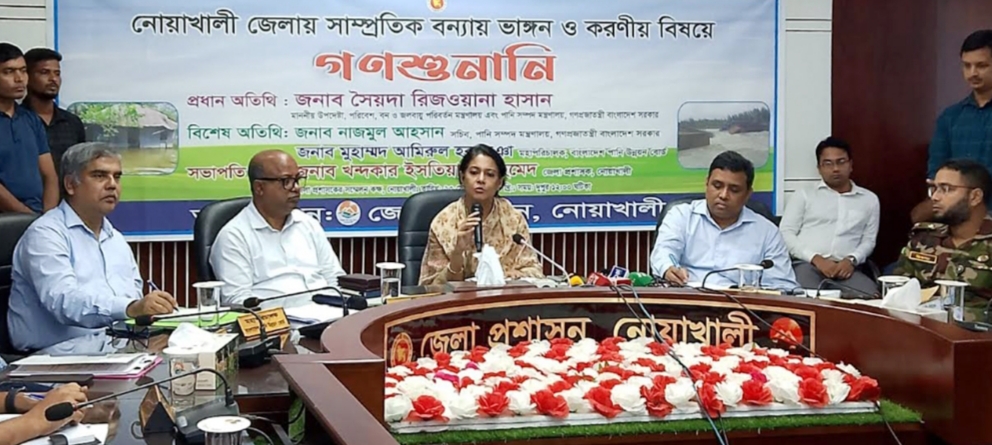 সোমবার ২৩ সেপ্টেম্বর দুপুরে নোয়াখালী জেলা প্রশাসক কার্যালয়ের সম্মেলন কক্ষে সাম্প্রতিক বন্যায় ভাঙন ও করণীয় বিষয়ে গণশুনানিতে প্রধান অতিথির বক্তব্যে তিনি এ কথা বলেন।মুছাপুর স্লুইসগেটের (রেগুলেটর) বিষয়ে সৈয়দা রিজওয়ানা হাসান বলেন, প্রাকৃতিকভাবে মুছাপুর রেগুলেটর ভেঙেছে। মুছাপুর রেগুলেটর নির্মাণ জরুরি। নদীভাঙন রোধে যতটুকু দ্রুত কাজ করা যায় তা করতে হবে।দীভাঙন প্রাকৃতিক দুর্যোগগুলোর মধ্যে একটি ভয়াবহ বিপর্যয় উল্লেখ করে তিনি বলেন, বালু উত্তোলন বিষয়ে অনেক অভিযোগ পেয়েছি। বালু উত্তোলন বন্ধ করতে হবে। বালুমহাল আইন পড়ে দেখেন। এর প্রভাবে আমাদের ঘরবাড়ি নদীগর্ভে বিলীন হচ্ছে। এটা ডিসি মহোদয়ের এখতিয়ার। তিনি প্রয়োজনীয় ব্যবস্থা গ্রহণ করবেন। নদীর তলদেশে কত বালু আছে, তা দেখতে হবে। নদীভাঙন হচ্ছে প্রাকৃতিক দুর্যোগগুলোর মধ্যে একটি ভয়াবহ বিপর্যয়।গণশুনানির শুরুতেই নোয়াখালী জেলায় বন্যার কারণে বিভিন্ন সেক্টরের ক্ষয়ক্ষতির পরিমাণ তুলে ধরা হয়। নদী ও বাঁধ ভাঙনরোধে প্রধান অতিথির দৃষ্টি আকর্ষণ করা হয়। জলবায়ু পরিবর্তনের কারণে প্রতিনিয়ত ঝড়-জলোচ্ছ্বাস হচ্ছে। আমরা নদীর তীরে বসবাসকারীরা নদীভাঙনের শিকার। ক্ষতিগ্রস্ত প্রান্তিক খামারিদের সহজ শর্তে ঋণের ব্যবস্থা করে দিলে তাদের জীবন চালাতে পারবে বলে জানান।এ সময় কোম্পানীগঞ্জ উপজেলার চরপার্বতী ইউনিয়নের চেয়ারম্যান কাজী হানিফ বলেন, একেবারে বালু উত্তোলন বন্ধ করতে হবে। নতুবা মাটি ধস রক্ষা করা যাবে না। নদীতে ড্রেজিং করতে হবে, পানি সরানোর গতি বাড়াতে হবে। জলাবদ্ধতার নিষ্কাশনের ব্যবস্থা করতে হবে। অবৈধ নদী/খাল দখল বন্ধ করতে হবে অথবা অবৈধ নদী/খাল দখল দ্রুত উচ্ছেদ করতে হবে। খাল সংস্কার না করলে পানি নামবে না। অবৈধ খাল দখলদার উচ্ছেদ করা জরুরি।বিবি রহিমা নামের ক্ষতিগ্রস্ত এক খামারি বলেন, অতীতে যারা সরকারে ছিল তারা ৩০-৩৫% এর বেশি ভোট পায়নি। ছাত্র-জনতা আপনাদেরকে সুযোগ করে দিয়েছে। আপনারা একটি সুন্দর বাংলাদেশ উপহার দেবেন। এ দেশের জনগণ আপনাদের মুখের দিকে তাকিয়ে আছে। বন্যার কারণে আমাদের মৎস্য প্রকল্পের অনেক ক্ষতি হয়েছে, আমরা সরকারি সাহায্য প্রার্থনা করছি।বৈষম্যবিরোধী ছাত্র আন্দোলনের নোয়াখালী কলেজের ছাত্র মো. আরিফুর রহমান বলেন, নদীভাঙন রোধ করতে হবে, পাশাপাশি ড্রেজিং করতে হবে। টেকসই স্লুইচ নির্মাণ হতে হবে, সেনাবাহিনীর মাধ্যমে নির্মাণ করতে হবে। বালু উত্তোলনকারীদের আইনের আওতায় আনতে হবে।রুহুল আমিন নামের এক এনজিওকর্মী বলেন, আমরা একজন এনজিওবান্ধব সরকার পেয়েছি। আমরা অনেক বৈষম্যের শিকার হয়েছি। এতদিন আমাদের এনজিওকর্মীদের সরকারের বিভিন্ন প্রকল্পে অন্তর্ভুক্ত করেনি। আগামীতে এনজিওক